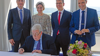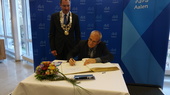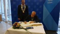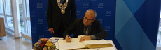 Der Intendant des Stuttgarter Balletts, Reid Anderson, trägt sich anlässlich des Gastspiels seiner Compagnie in der Stadthalle in das Goldene Buch der Stadt Aalen ein.
