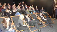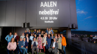 Der erste Aalener Bürgerchor, gegründet auf Initiative des Stadttheaters, präsentiert in der Stadthalle den Sprechchor „Wir sind die nebelfreie Stadt“.
